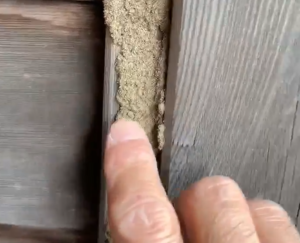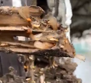 動画あり。長年の雨漏りが原因で、壁体内がイエシロアリに食害されていました。